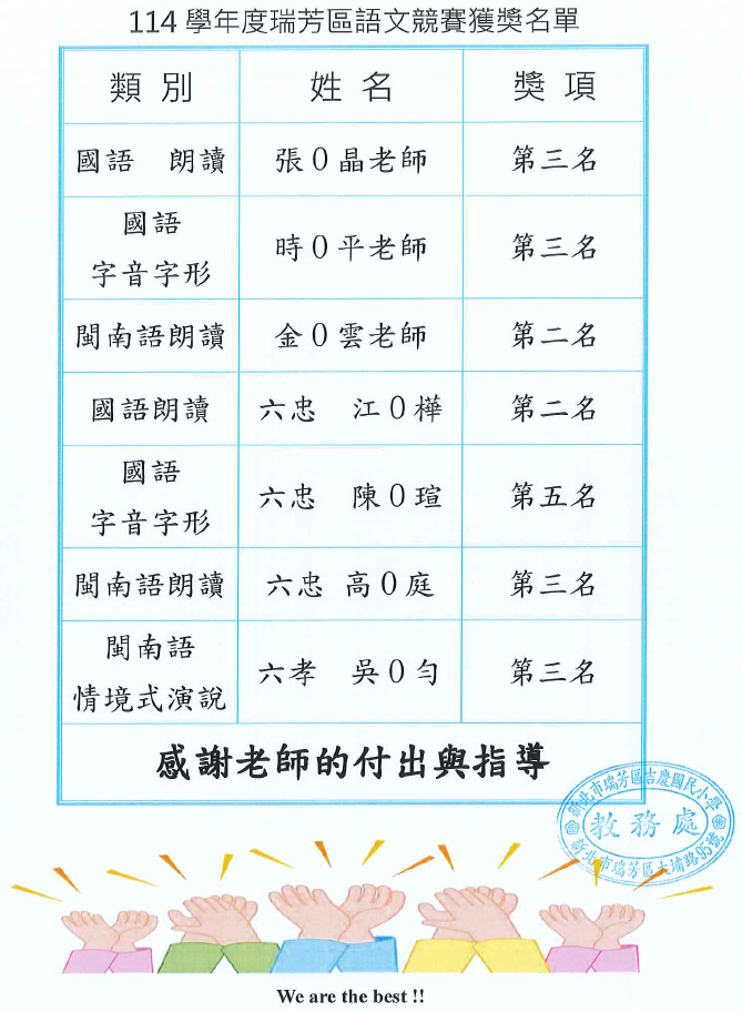 賀!本校參加 114年度瑞芳分區語文競賽 成績優異