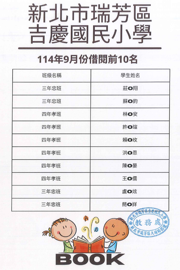 新北市瑞芳區吉慶國民小學114學年度上學期9月份借閱前10名